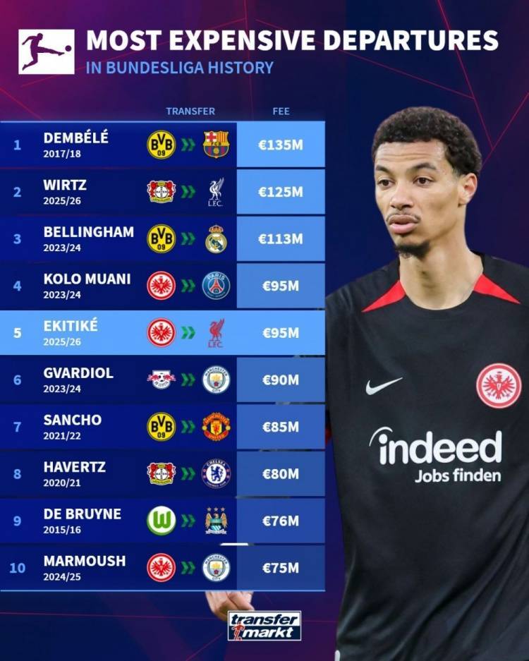 德甲转出费用排名:埃基蒂克9500万欧并列第4,前10多特法鹰各3人